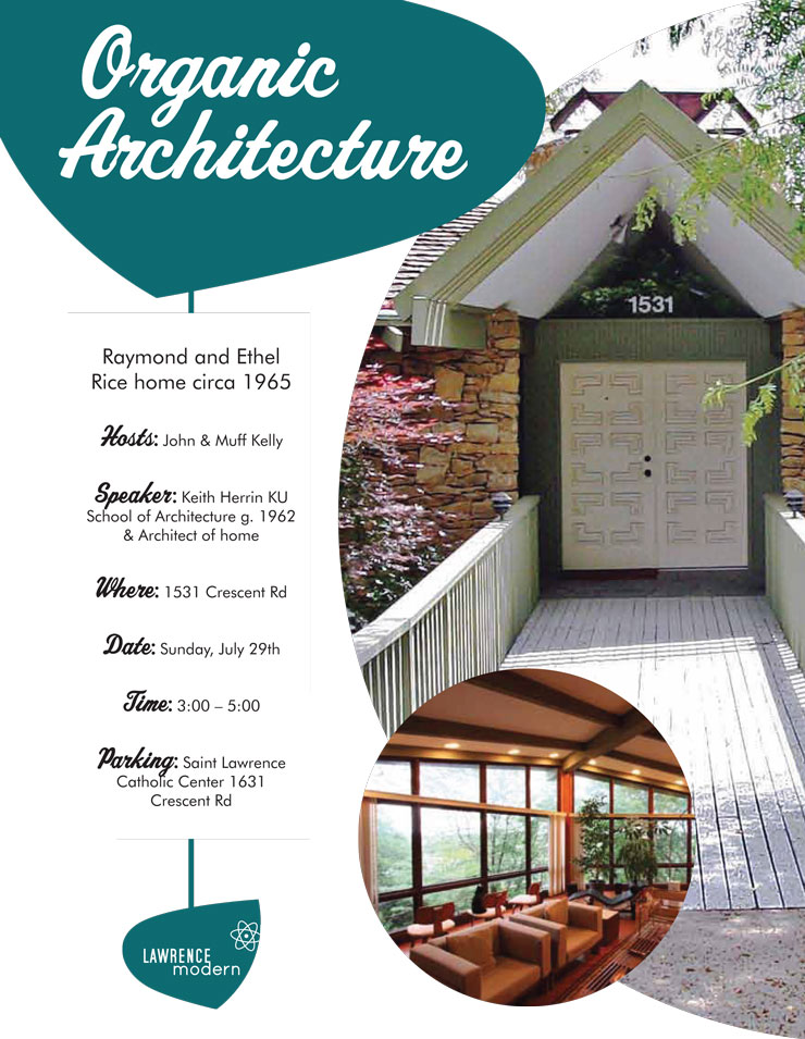 Sure to be the coolest Lawrence Modern event this summer, our next gathering will be at a leafy modernist retreat west of campus owned by John and Muff Kelly. Architect Keith Herrin, a former KU Architecture grad, will be on hand to talk about the design of the house, which was originally built in 1965 for Lawrence philanthropists Raymond and Ethel Rice. Parking is not allowed on Crescent Road, so please park in the Saint Lawrence Catholic Center parking lot on the corner of Crescent and Engel Road. Also, please do not bring any food or drinks to this gathering. See you July 29th!