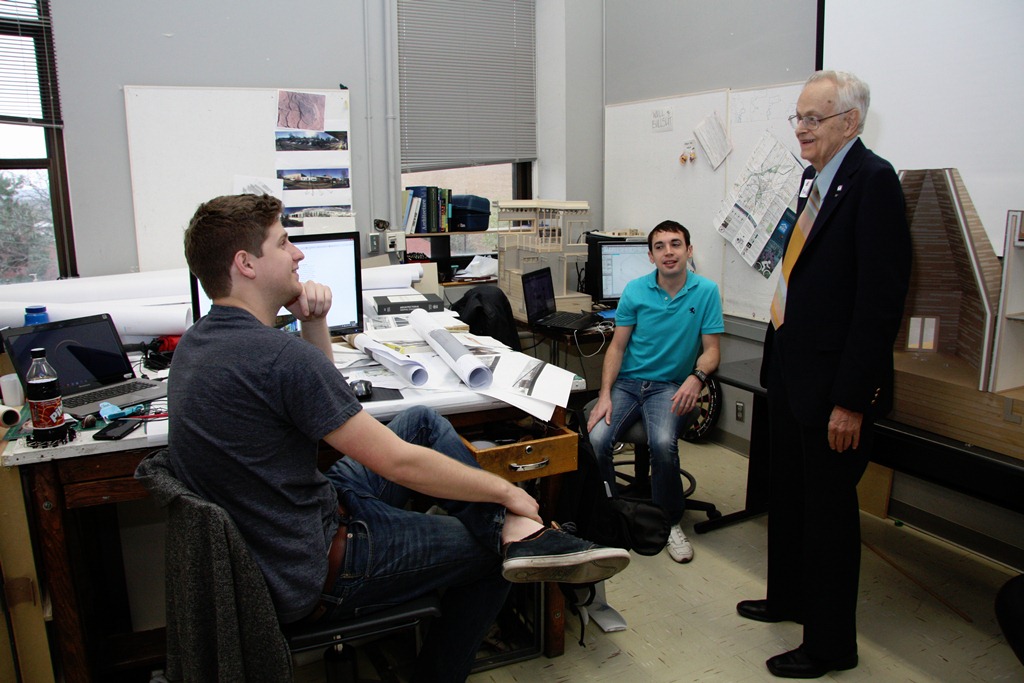 Bob Hess meets with architecture students Kyle Kutz (left) and Cole Giesler (middle) in Marvin Hall.