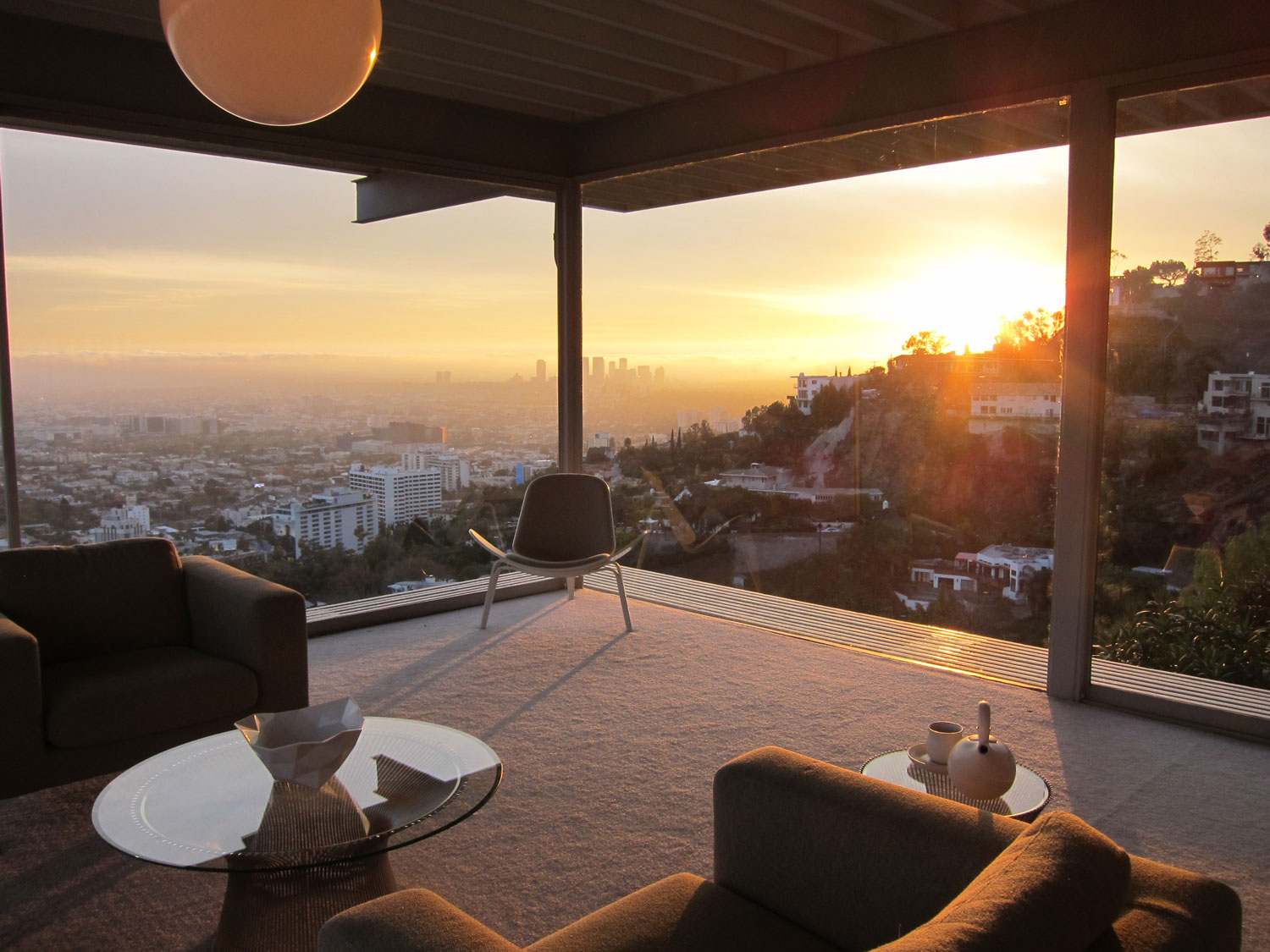 My wife and I recently had the opportunity to tour the Stahl House on a trip to Los Angeles. More than any other house I’ve visited, it left me in a state of wonder that lingered long after I set foot on the property. Of course much of this has to do with the magnificent views, which sweep from the ocean to the mountains, but also the elegant way in which Keonig’s design melds with the grid-like pattern of the cityscape below. It fits the picture. The huge glass windows bring this copper-toned spectacle into full view by day; by night the lights of L.A. itself become a sparkling Tiffany window.