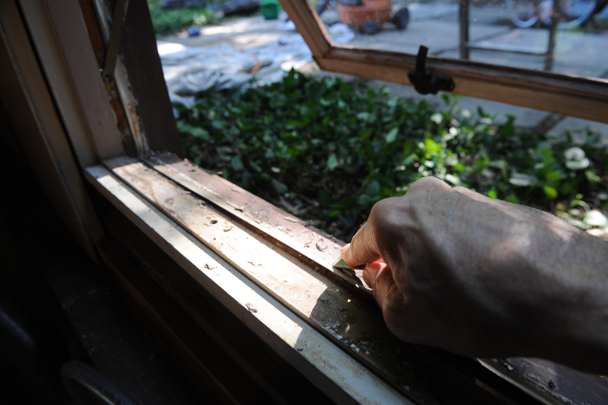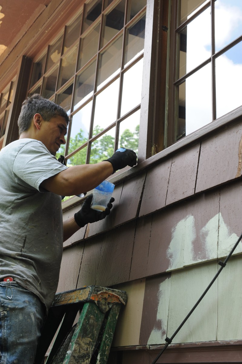 Last summer, upon a referral, we sought out the services of Rob Lacey, a lanky and dexterous 50-something who, for 25 years, has ensured the exterior (and interior) preservation of many OWL dwellings. After two on-site consultations, Rob provided a basic services proposal using Benjamin Moore Ultra Spec flat or satin paint for $9,480. (If we wanted to change the original color, it would cost an additional $4,250.) This fit within our budget, which I estimated would land somewhere between ten to fifteen grand. As part of the deal, Rob agreed to discount the price when I offered to prep the front door for painting, handle storm window removal and reinstallation, and also clean all the windows.