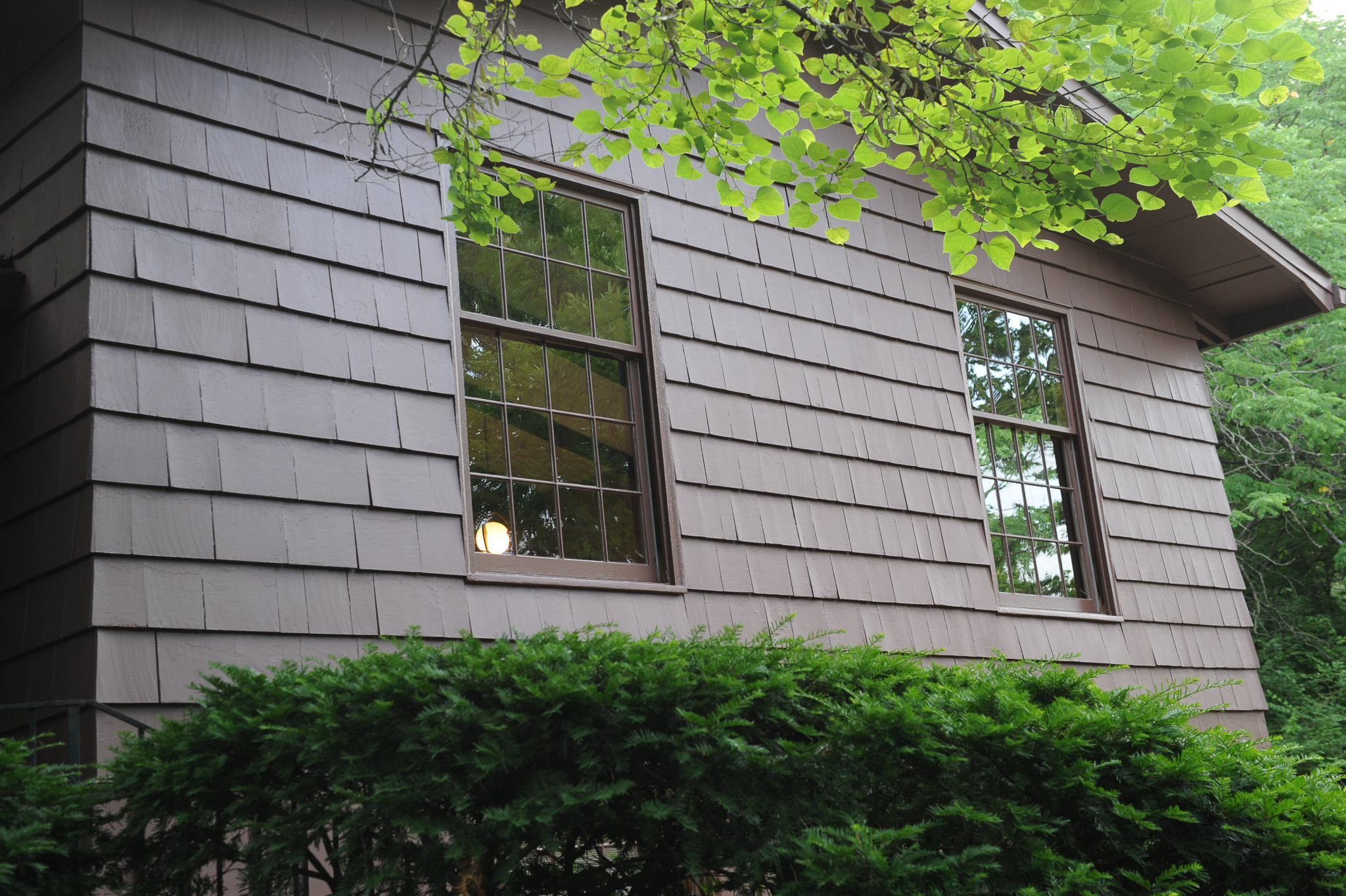 The only thing left to decide was the paint color and finish type. This led to some debate as we considered the economics, aesthetics, and environmental impact of our choice. Dark paint absorbs heat, which is a problem for our poorly insulated house. I calculated, however, that the heat gain in summer would be offset by heat loss in winter, practically negating each other. We decided to keep the same dark brown color the house had when we bought it in 2007, and as we later found, hadn’t changed since the house was built. Meanwhile, Rob convinced us to go with a flat finish for the body and satin for the trim after proving in a demo that satin would dramatically highlight the imperfections of our cedar siding, akin to applying oily makeup on acne.