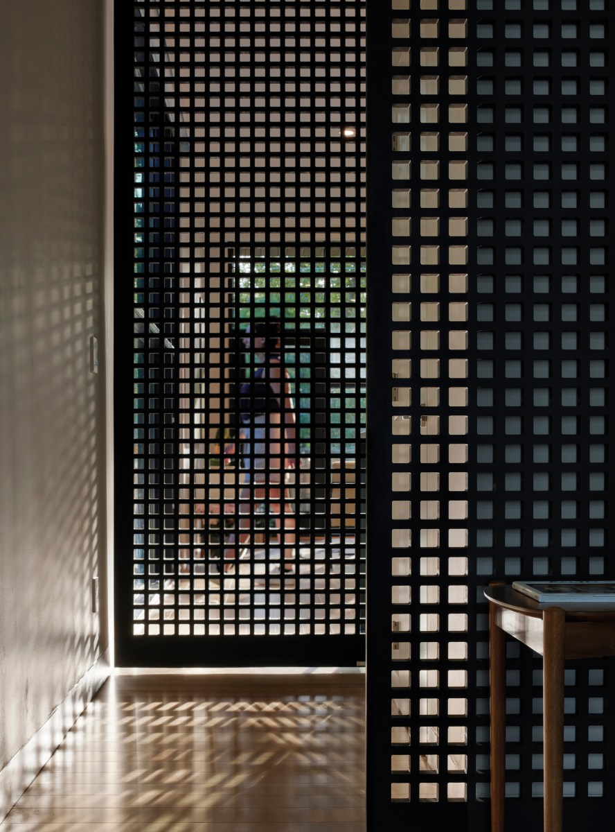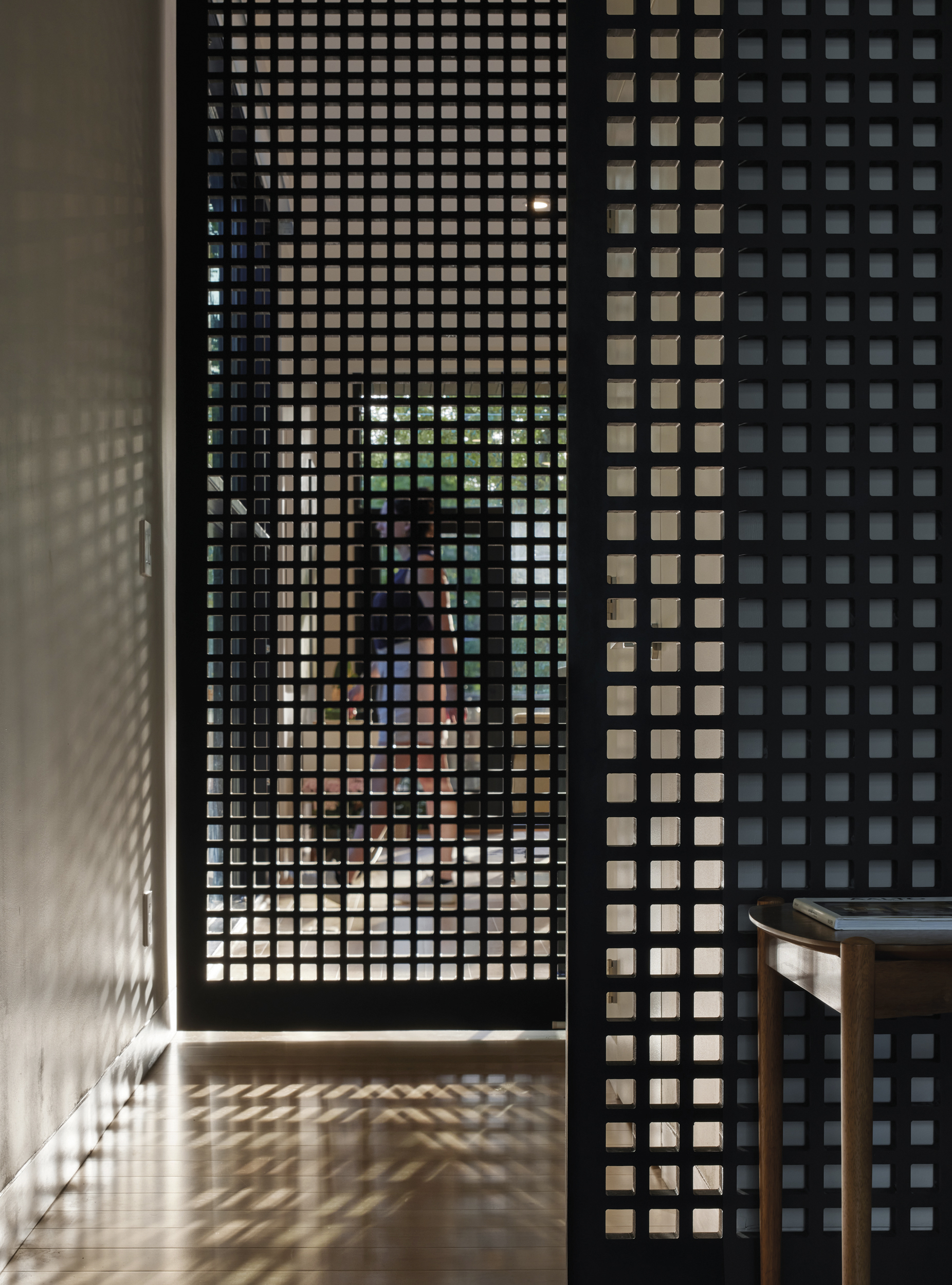 A good example of that fine-tuning, Johnston said, is the sliding black doors that separate the bedroom/bathroom from the main living area. Milled out of Richlite, a high-end recycled paper material, the thick and heavy perforated doors look like something you might find in a Turkish palace or a Japanese yakuza boardroom. Essentially decorative privacy screens, they provide filtered light that is quite stunning early in the morning. This see-through contributes a lot to the transparent feeling of light and space but still gives people living in the house the freedom to open up or close as they wish.