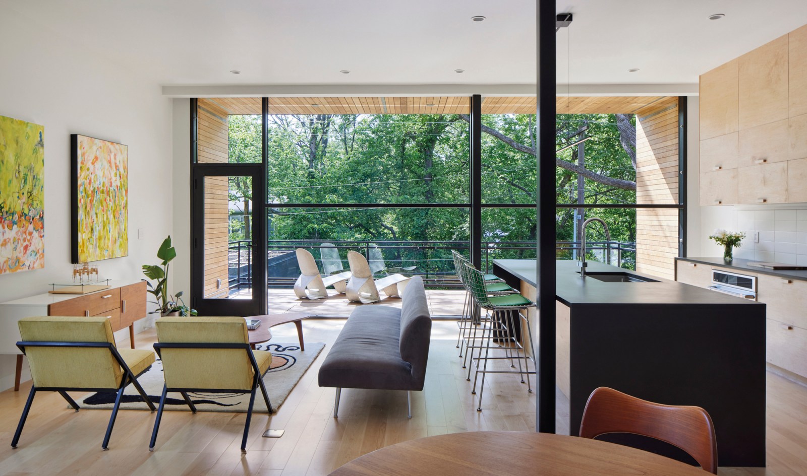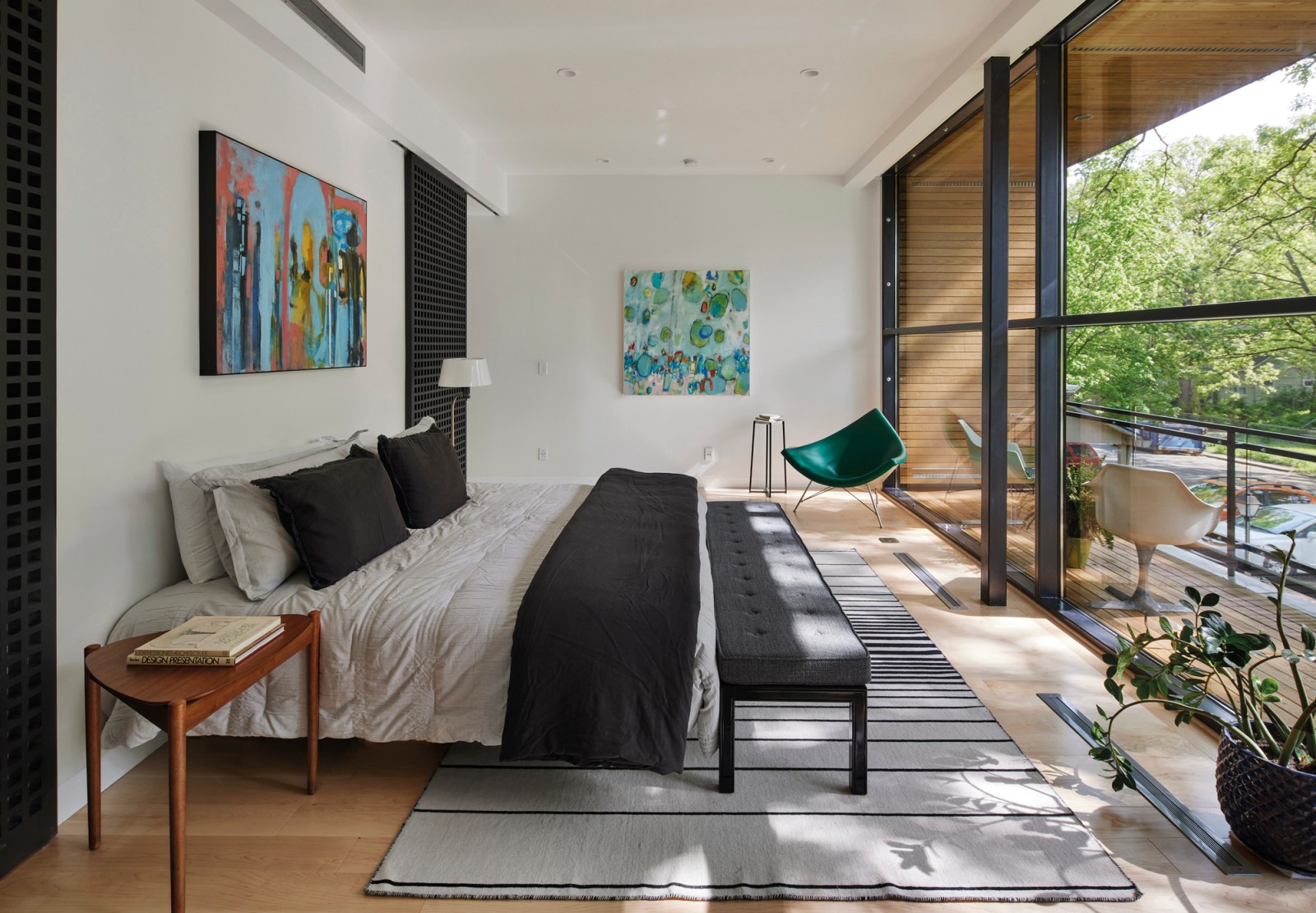 Reminiscent of Le Corbusier’s Villa Savoye, a modern take on the traditional French farmhouse, the Indiana Street House similarly achieves a “floating” effect for a luxurious, beautiful box that sits elegantly in the landscape. In some aspects, it resembles an architectural lookout station or a treehouse, especially with the way the trees envelop the house. The living spaces are elevated and have controlled views on the east and west through massive “curtain walls” (sheets of glass in architecture-speak) that also open to balconies. A large window on the south side of the house is shaded by a louver that blocks 90 percent of summer sun but allows full sunlight to enter in winter. The result is a wonderfully open ambiance characterized by shifting light patterns throughout the day. This was achieved despite the house being on a very narrow lot, squeezed on both sides by multi-story houses.