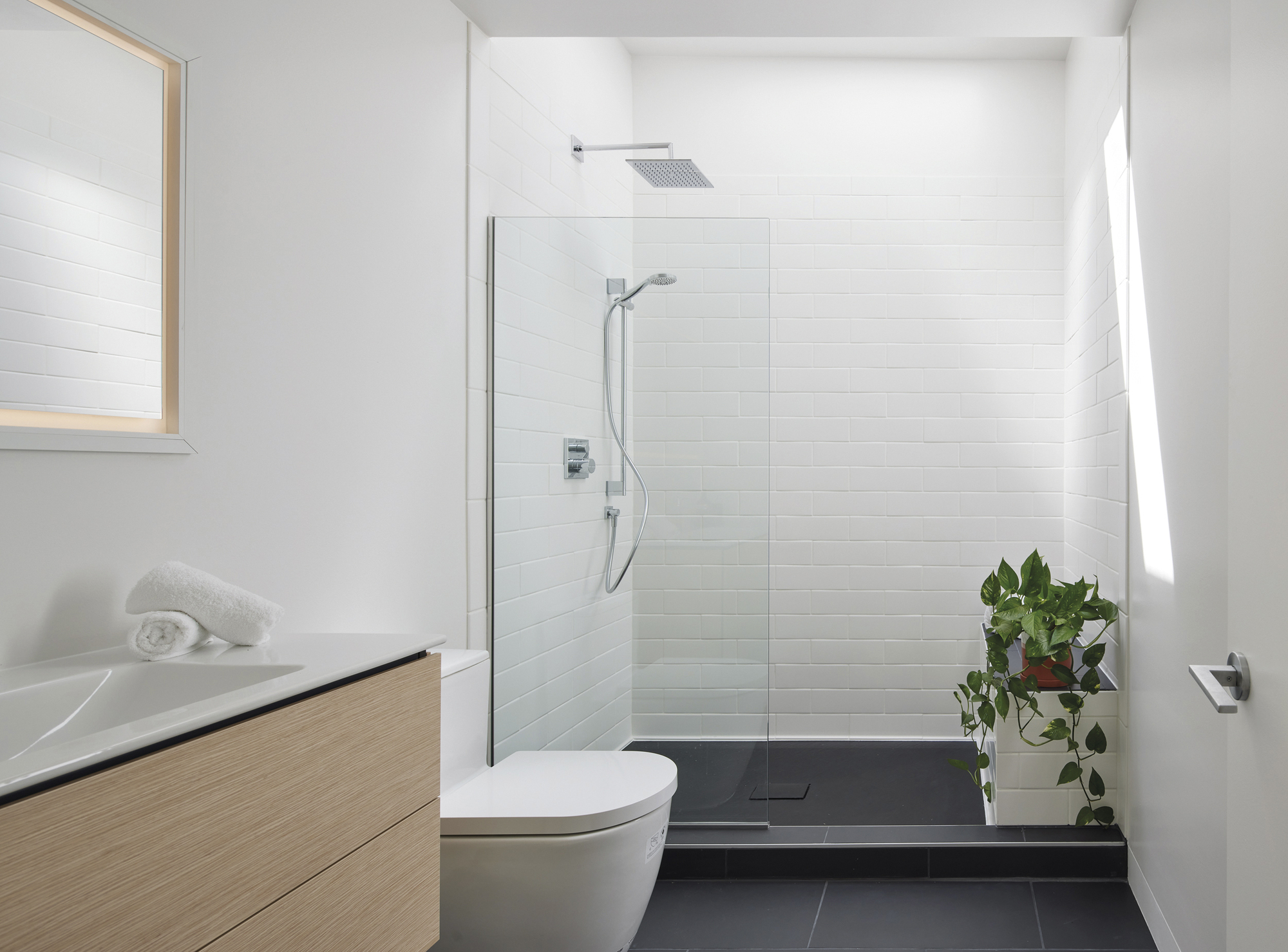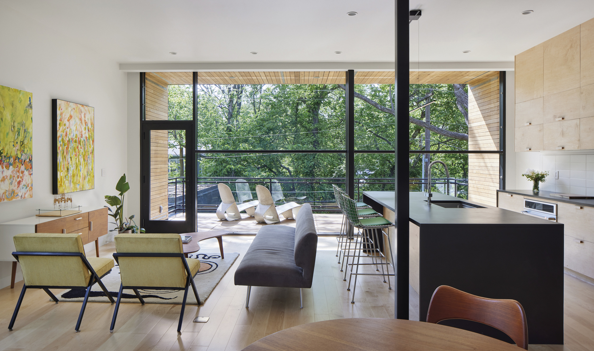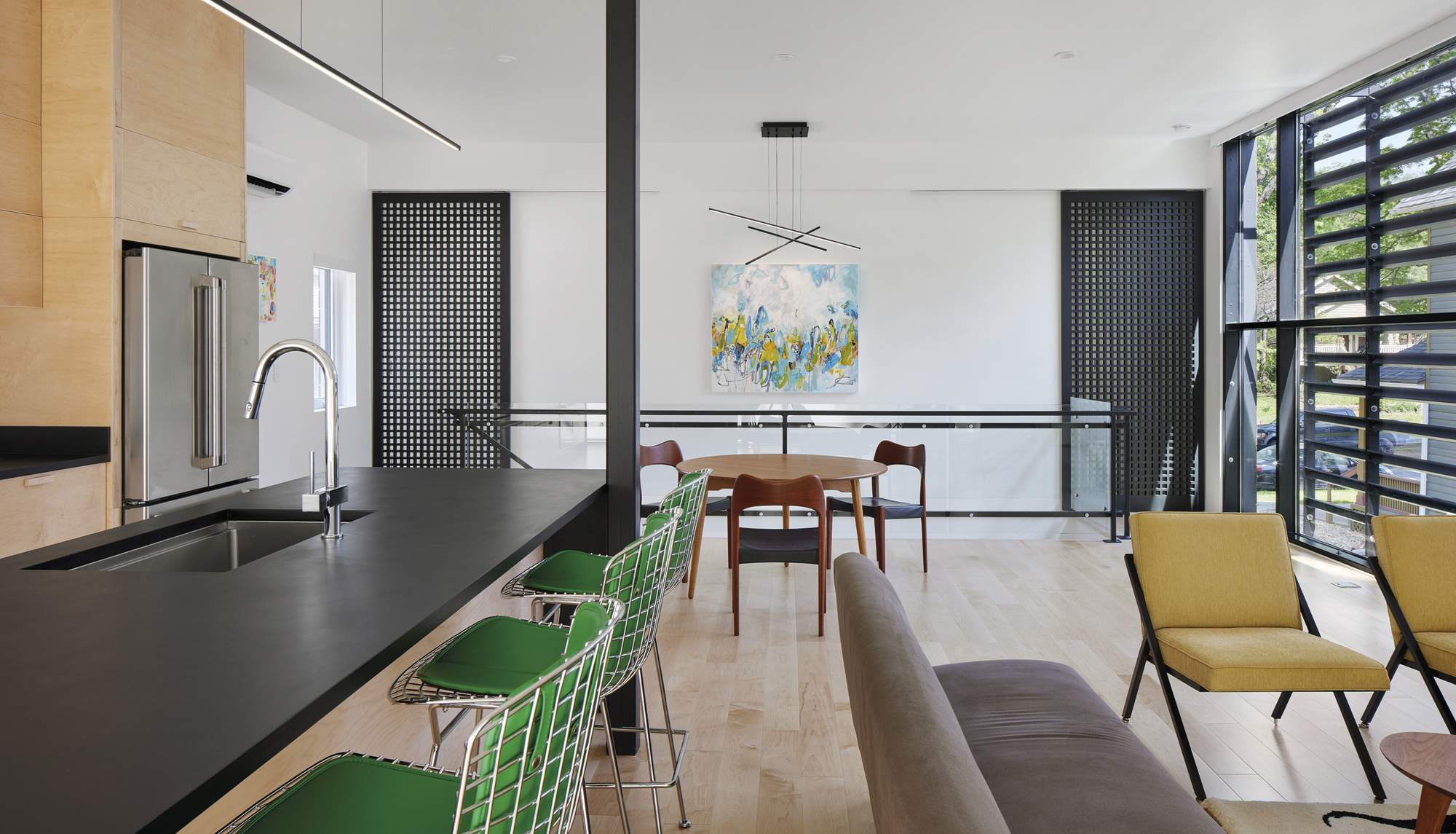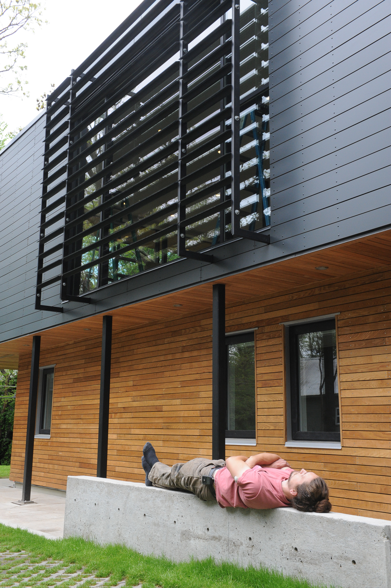 The building’s charcoal outer cladding, made of a high-pressure laminate material called Fundermax, works in tandem with the inner cocoon to achieve a high R-factor. The cladding is physically separated by a ventilated “rainscreen,” a technology developed in Sweden. Rockhill explains: “In the old days, clapboard, stucco, or shingle was the extent of exterior finishes. Now we can pull that off the face of the building and literally have a drainage plane behind it. We can separate the two, we can have something that looks really great, lets the water through, hits the drainage plane and then comes down and drains out.”