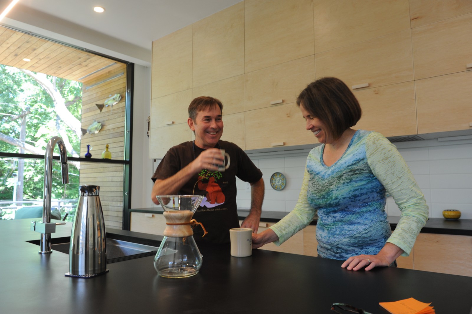 While considering housing options in Lawrence last year, they came across Studio 804’s website. After emailing Dan Rockhill out of the blue asking about the Indiana Street House, which was still under construction, they found out it was for sale. Upon making two trips to the site and meeting with 804 students, they were sold. “We were like, ah ha, this is really cool,” Kelly said. “It’s an opportunity to own and live in a modern house with modern technology that from the beginning was designed to be a sustainable green building, urban sustainable living.”
