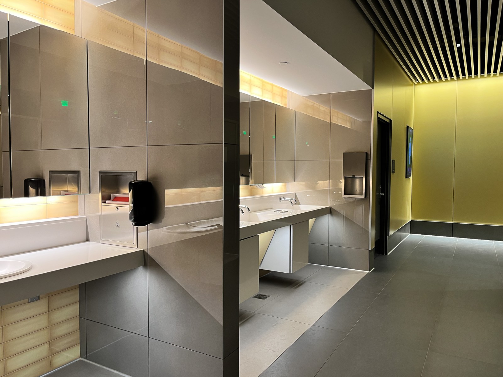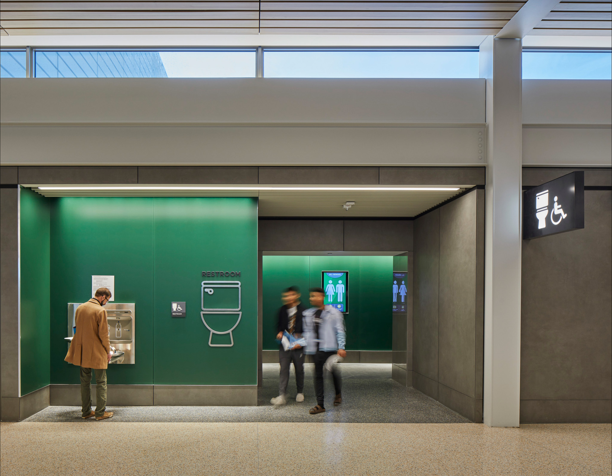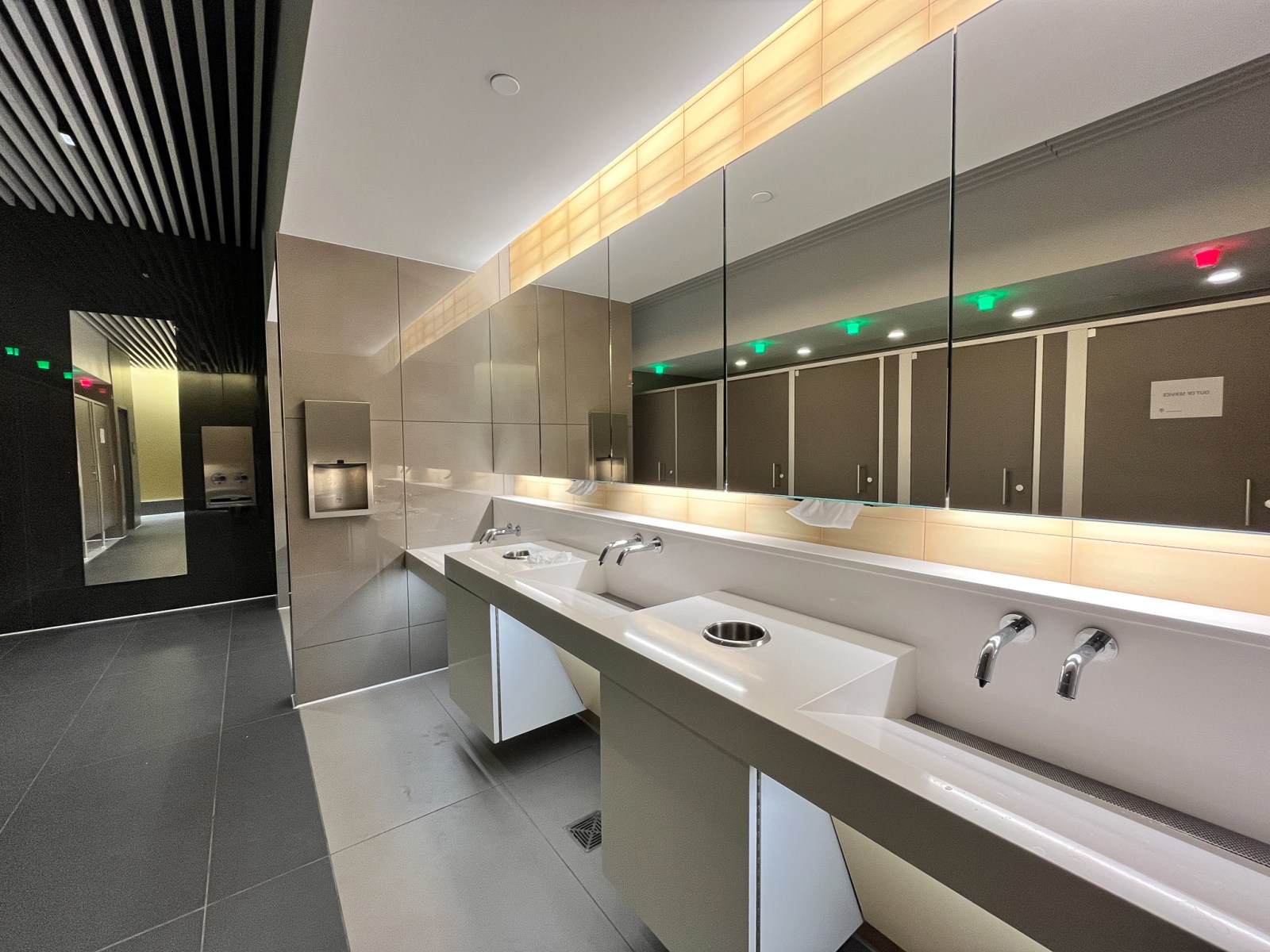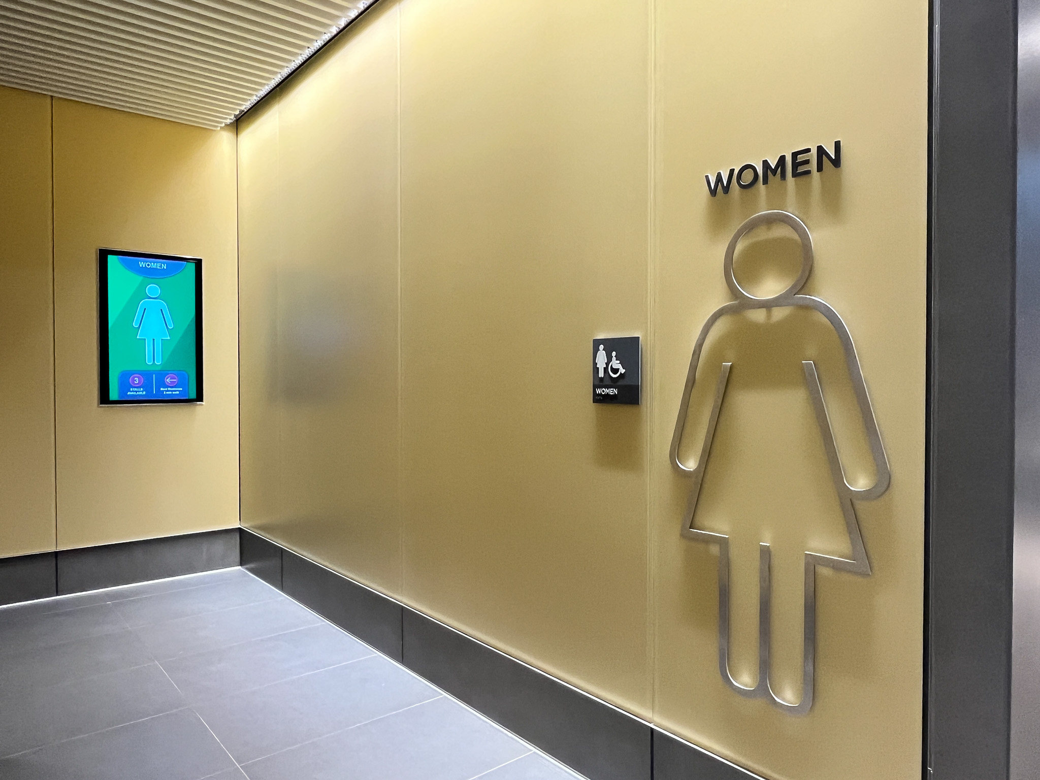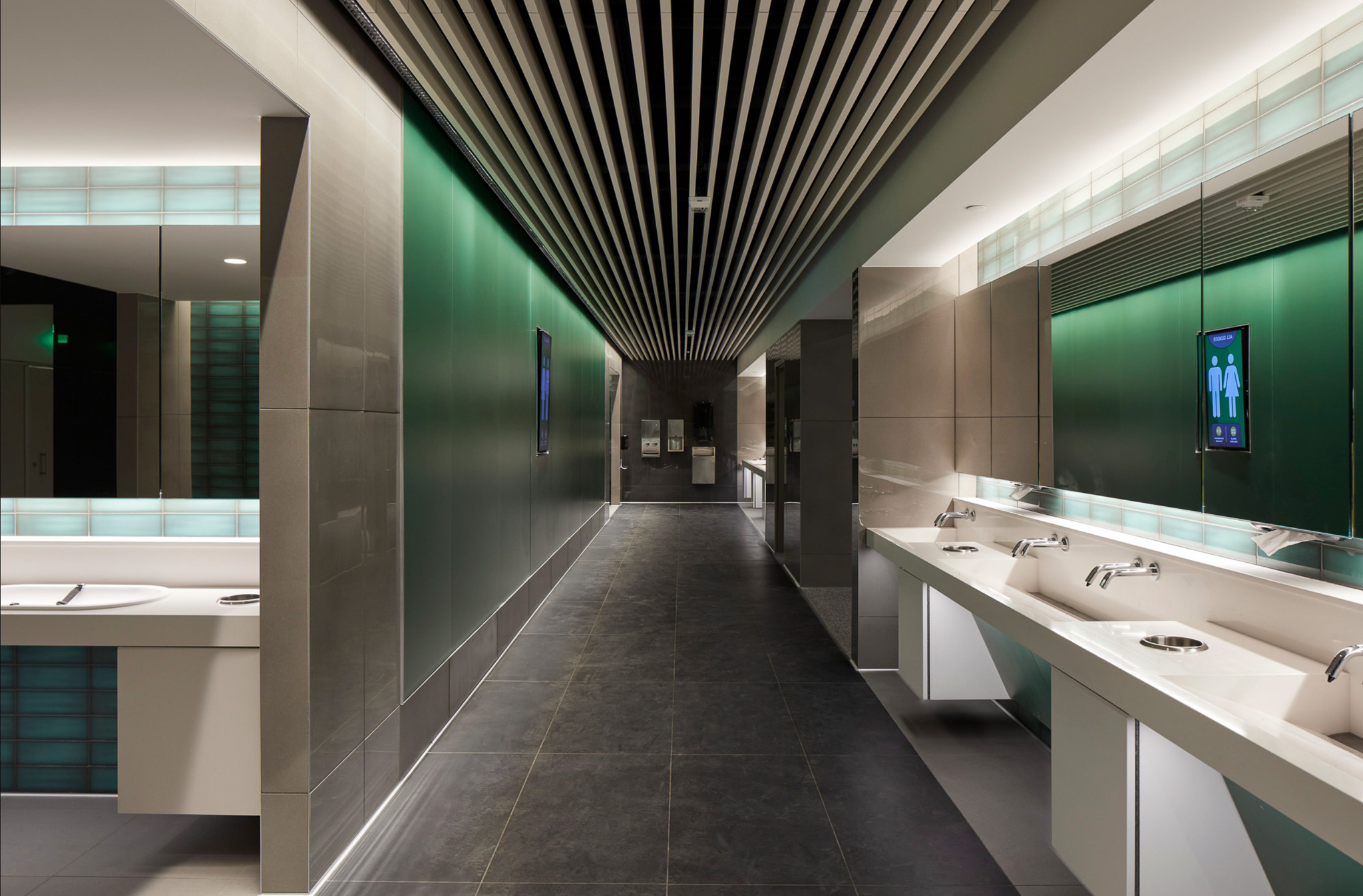 I don’t know if you noticed the occupancy indicators above each stall, the red light green light, just like the parking garage? That then feeds into the display at the entrance that indicates the number of stalls that are open on either side, which makes things a lot easier hopefully for passengers. And then also all of the accessories are actually building maintenance system integrated. So they report back to the building maintenance system how many paper towels have been used and squirts of the soap dispenser and all that, so that they know when to cycle their maintenance through. So there’s a lot that went into that, but I think in terms of the way that we think about the bathrooms, you want the bathroom to read as something that is in contrast to the standard finishes of the building so that it has a wayfinding element to it. And so there we chose a back-painted acid etched glass that that forms those walls. It has this very light acid edge that gives the colors a kind of softness to them.