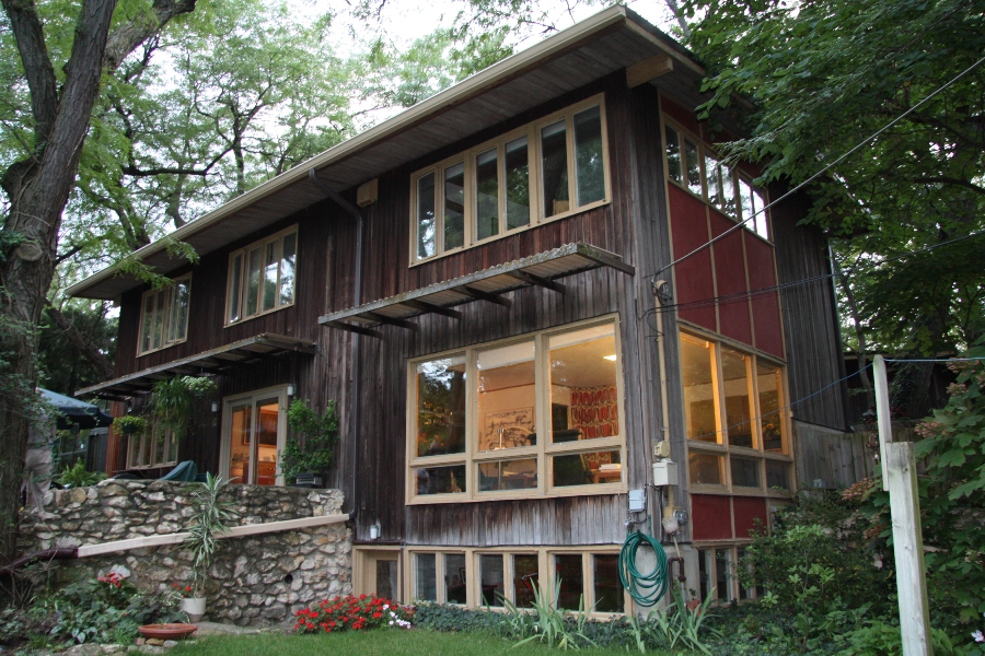Cyrus DeCoster, a KU Spanish professor, commissioned Dana Dowd, a 25-year-old architecture grad, to design this remarkable hillside house on Sunset Drive for his wife and family. Hugging a steep slope, the house clarifies the separation between public and private domains by exploiting a sharp drop in elevation from the street entry to the lower backyard. The attendant problems posed by such difficult siting are overcome with clever design, solid engineering, and superb integration of the inside and outside.