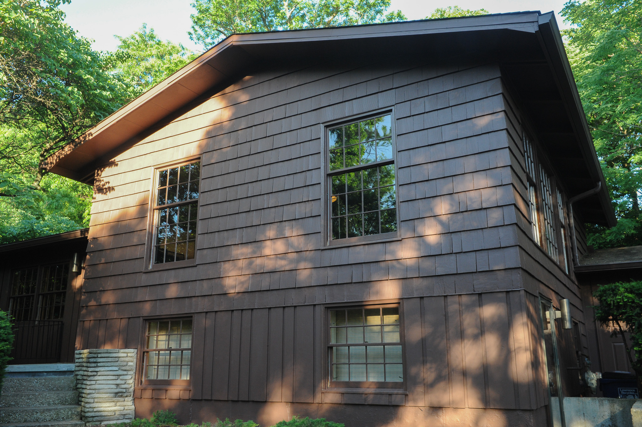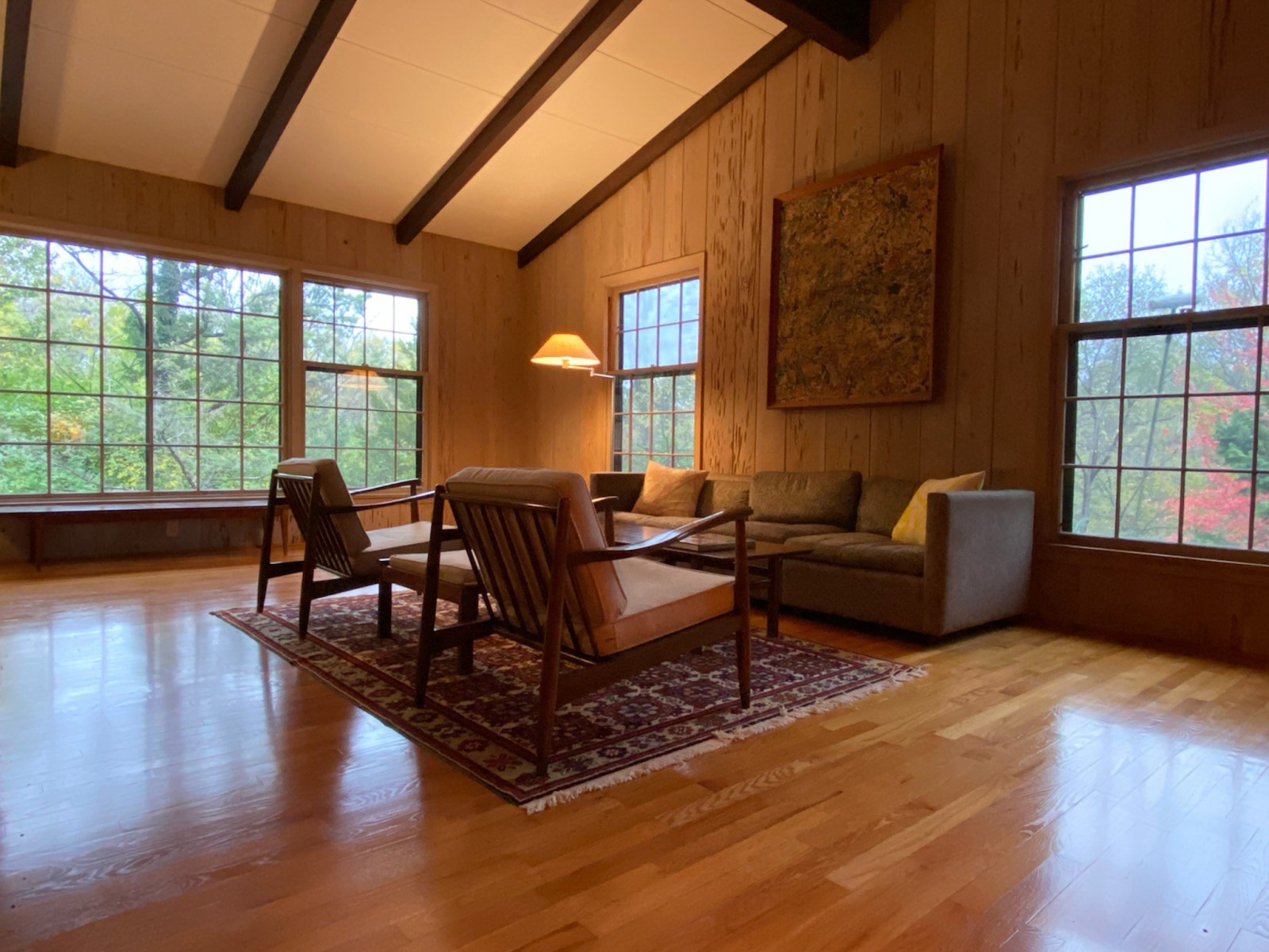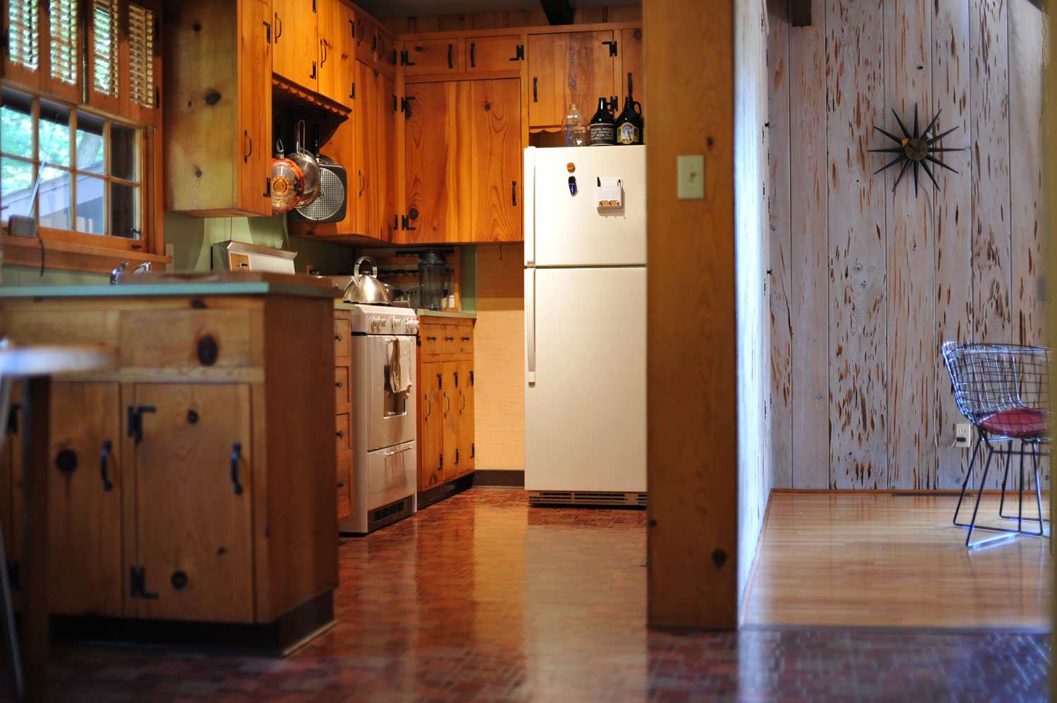In addition to its secluded site, the house exhibits outstanding originality and architectural integrity. Except for minor alterations to the bathrooms, the house is unchanged. The kitchen, in particular, is a time capsule of mid-1950s contemporary living, showcasing original Formica countertops, knotty pine cabinetry, a built-in barbecue, vintage gas stove, custom-order Andersen Pressure Seal double hung windows, a Modeline chain lamp, and authentic Armstrong Embossed Inlaid Linoleum No. 5352. All selected and preserved by Marion Howey, a former government documents librarian at the Spencer Research Library who knew what she wanted and usually found a way to get it.