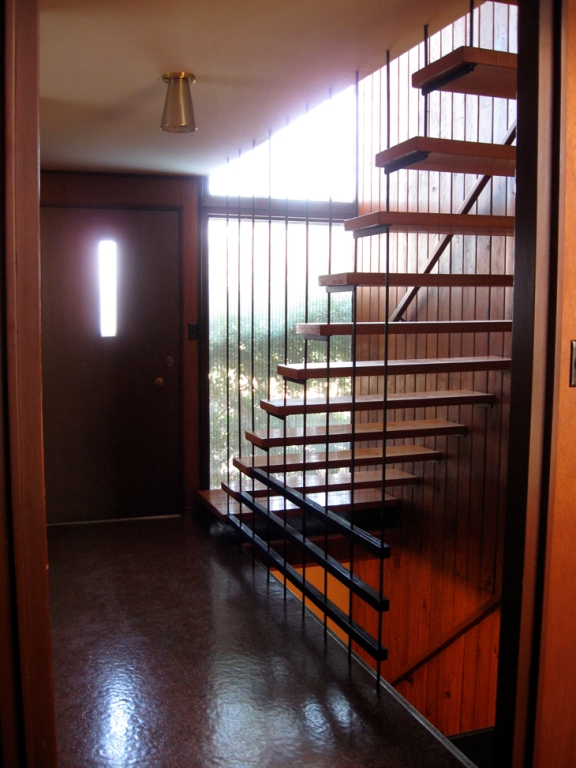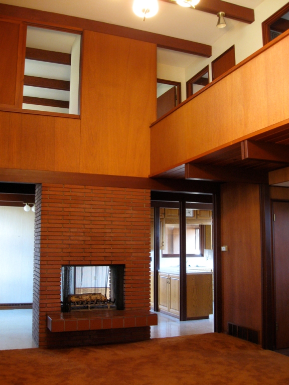 Heylman served in the Navy during WWII and was stationed in Japan during the Occupation. While there, he developed an appreciation for traditional Japanese architecture and its emphasis on simplicity and structural honesty. It is manifest here. From the entrance hall, a floating stairway suspended with metal rods leads to a balcony hallway upstairs that overlooks the living room below. A freestanding fireplace with a raised hearth rises to support the second story and provides separation between the living areas. With no interior doors, movement within the house is free-flowing and relaxed. Room-filling natural light is provided by 12X12-foot north-facing windows that reach the top of the cathedral ceiling. Mahogany paneling adorns the walls, providing a rich contrast to the milky white tile flooring. The space is delightfully airy, refined, and minimal.